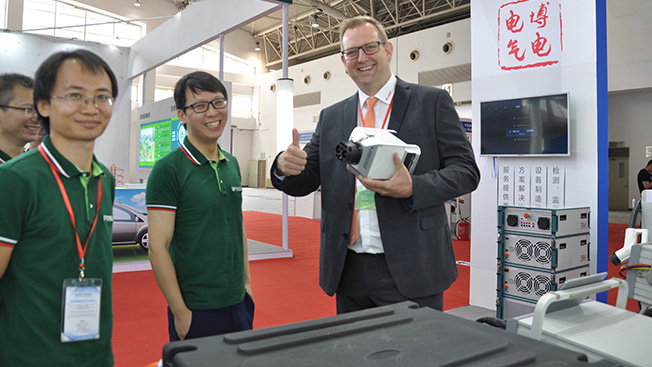▲来自德国的技术专家为博电手持式电动汽车充电检测仪点赞